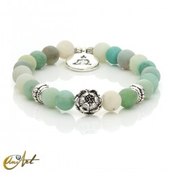 This handmade bracelet is made with 8mm natural amazonite beads with a matte finish and metal beads with Buddhist symbols.