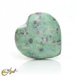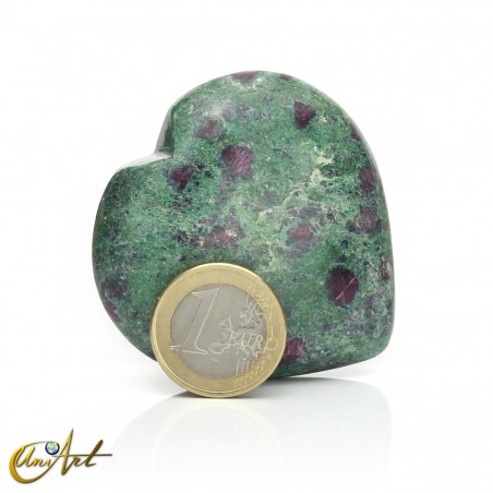 Heart-shaped figure carved from natural ruby in zoisite, a striking mineral combination featuring reddish ruby inclusions within a green zoisite matrix.