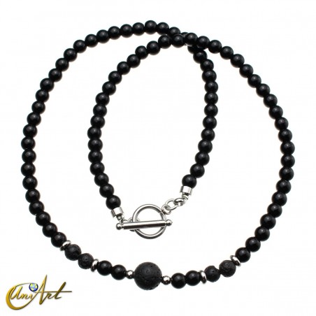 This necklace, approximately 53 cm in length, is meticulously strung with 6 mm black obsidian beads, interspersed with side and central beads of other stones to choose from among tiger's eye, bull's eye, or black volcanic lava. These beads, with the central one being 10 mm, are the visual focus of the design.