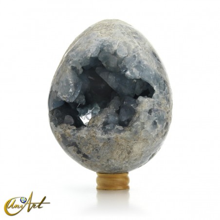 Esta impresionante geoda de celestina azul ha sido transformada en una fascinante pieza en forma de huevo a través de un minucioso proceso de labrado artesanal.