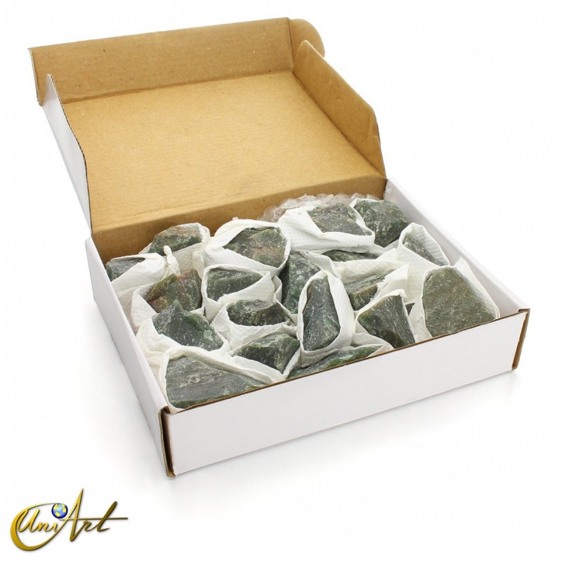 El contenido de cada caja es de entre 10 y 25 trozos de Jade Verde en estado bruto, de tamaños y formatos irregulares. El peso total es de un kilo como mínimo.