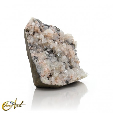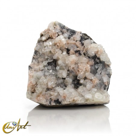 Entre los cristales de apofilita se aprecian pequeñas formaciones de estilbita en tonalidades melocotón, que introducen matices cálidos y un contrapunto cromático sutil dentro del conjunto. La presencia del basalto como roca soporte refuerza el carácter geológico del espécimen y aporta una base visualmente sólida y estable.