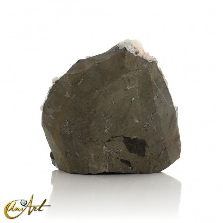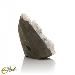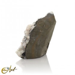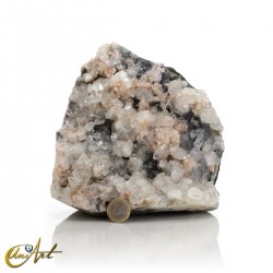 El ejemplar presenta una cristalización destacada de apofilita blanca, con cristales bien definidos y de aspecto translúcido, distribuidos de forma irregular sobre una base de calcedonia gris oscura generando un contraste muy marcado con la apofilita blanca, realzando la geometría de los cristales y aportando una lectura visual clara y potente del conjunto mineral.