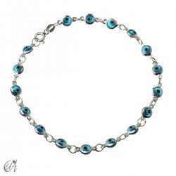 Esta pulsera es una fina joya de plata que presenta 16 ojos turcos en vidrio tipo murano de unos 4 mm de diámetro.